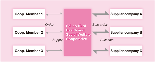 組合が、紙おむつをはじめとする衛生用品等を一括で購入することにより、仕入コストの低減を図り、委託品を低価格にて供給する事が可能になります。