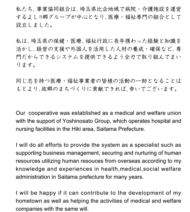 We will work on developing and securing human resources by utilizing the Overseas Technical Intern Program, which was created with the aim of contributing to human resource creation in developing countries in Asia.